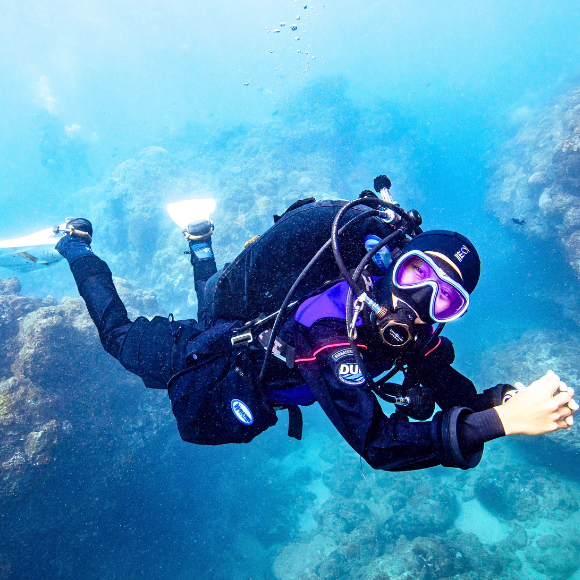 與濕式潛水衣不同,乾式潛水衣內部充滿空氣。 在你的乾衣課程中,你的教練將教你如何控制乾衣中的空氣以及浮力。